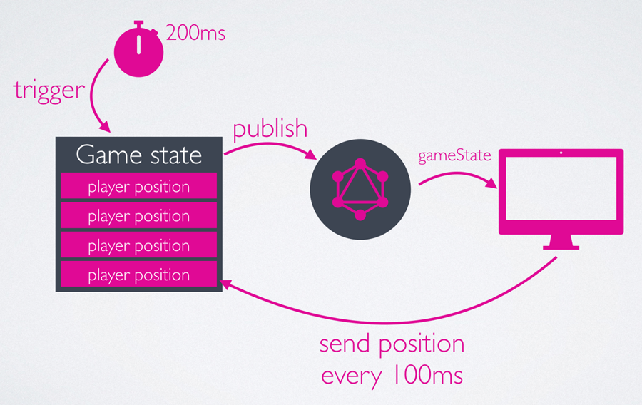 The approach we decided on taking is usually referred to as “game tick”. We set up a timer that triggers every 200ms and publishes the game state to the gameData subscription. This was one of the most significant changes we made to allow for low latency, in our state synchronization process, and it was done with a couple lines of code, thanks to the way GraphQL subscriptions work.